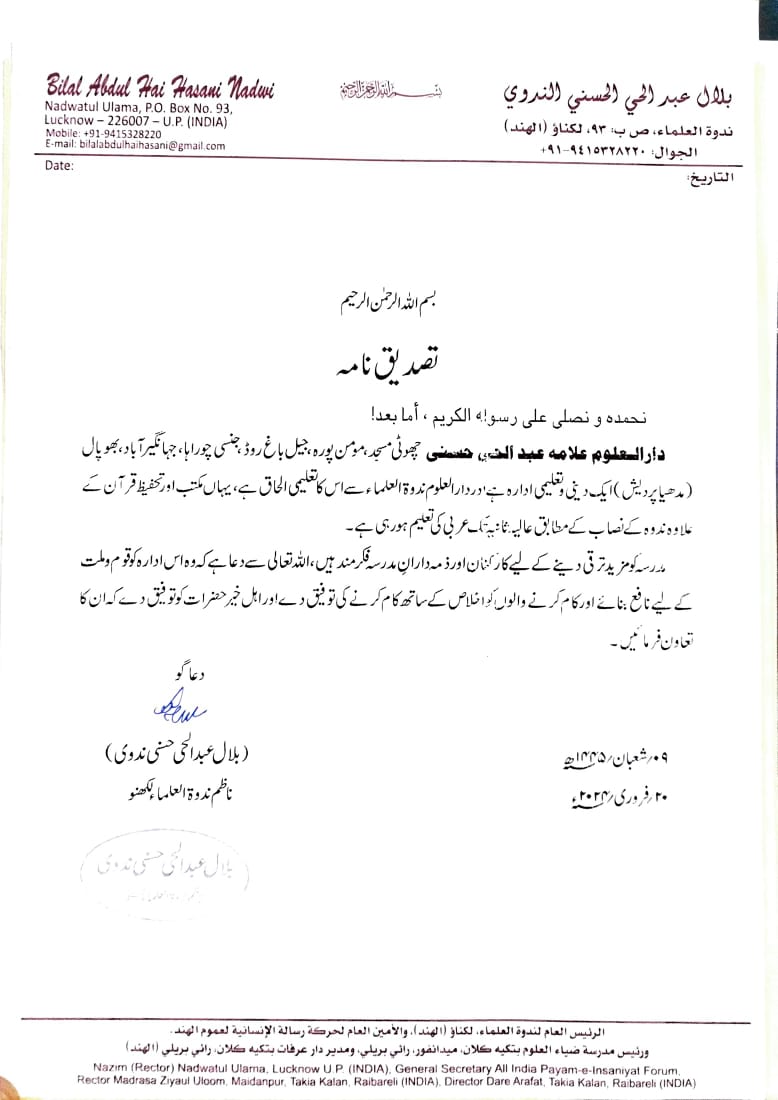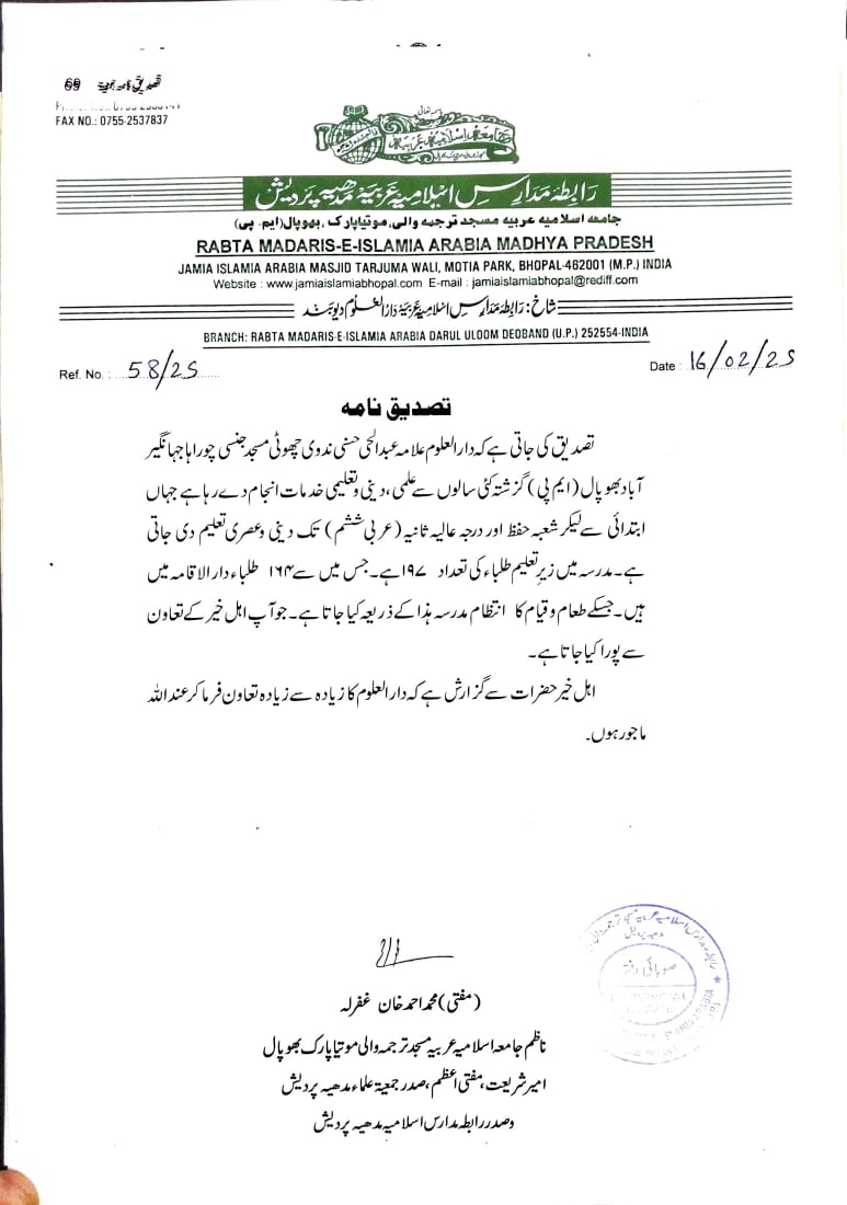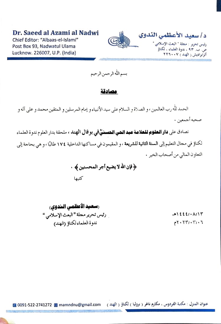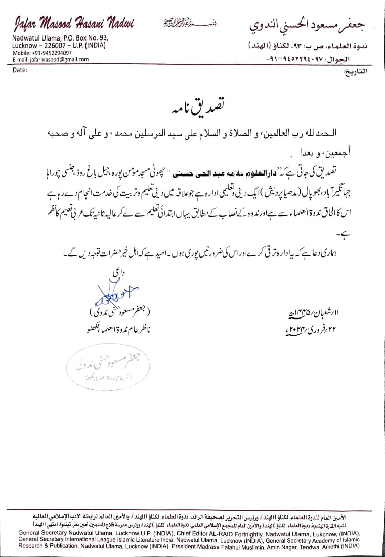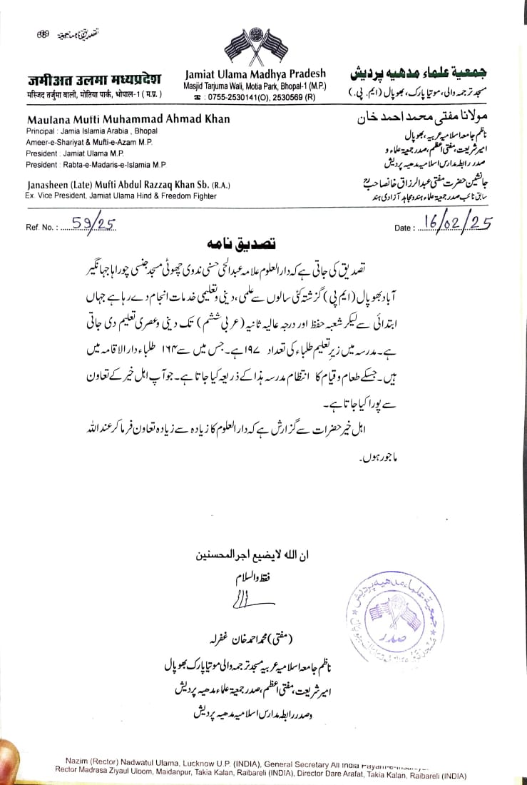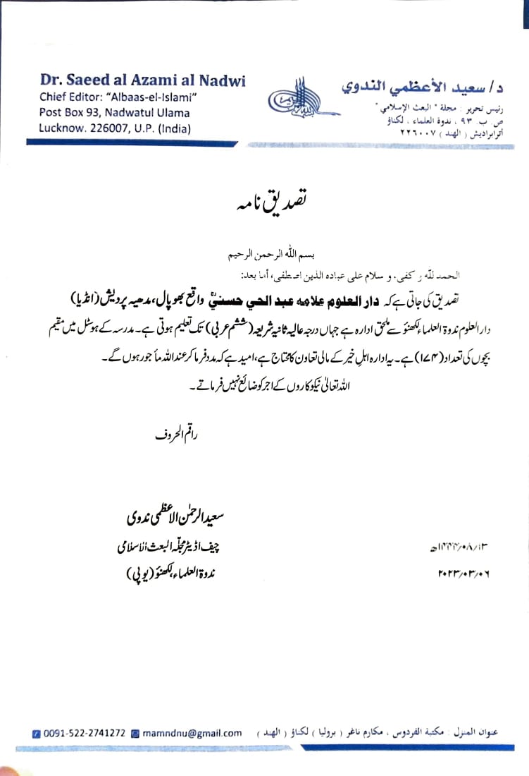 We offer our prayers in the court of Rabbul Izzat that Darul Uloom Allama Abdul Hai Hasani Nadvi Jinsi Chauraha, Jahangirabad in the city of Bhopal, which is a respectable branch of Darul Uloom Nadwatul Ulama Lucknow, in which education up to Showaba-e-Maktav, Showaba-e-Hifz and Showaba-e-Alimiyat Aliya Sania (Arabic Shashum) is continuing and complete, and Insha Allah, from this year, Showaba-e-Tajweed and Creation (Riwayate Hafs and Qiraate Saba'a) are also going to be started.