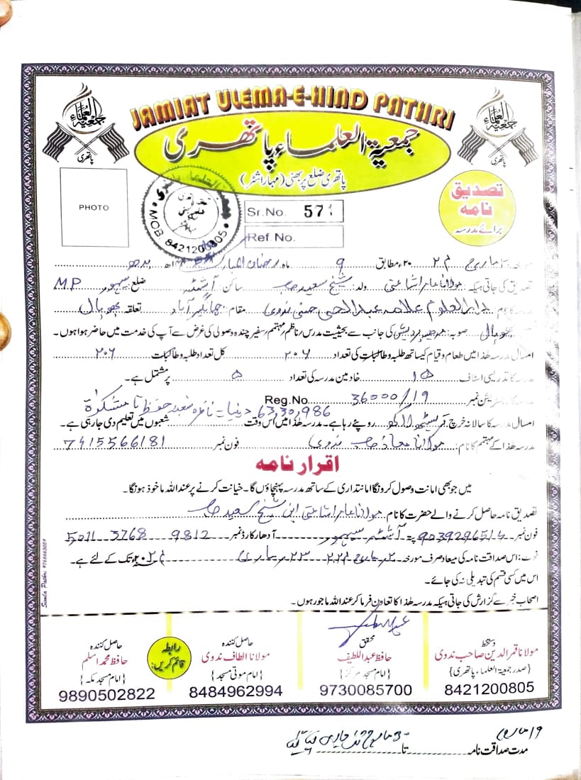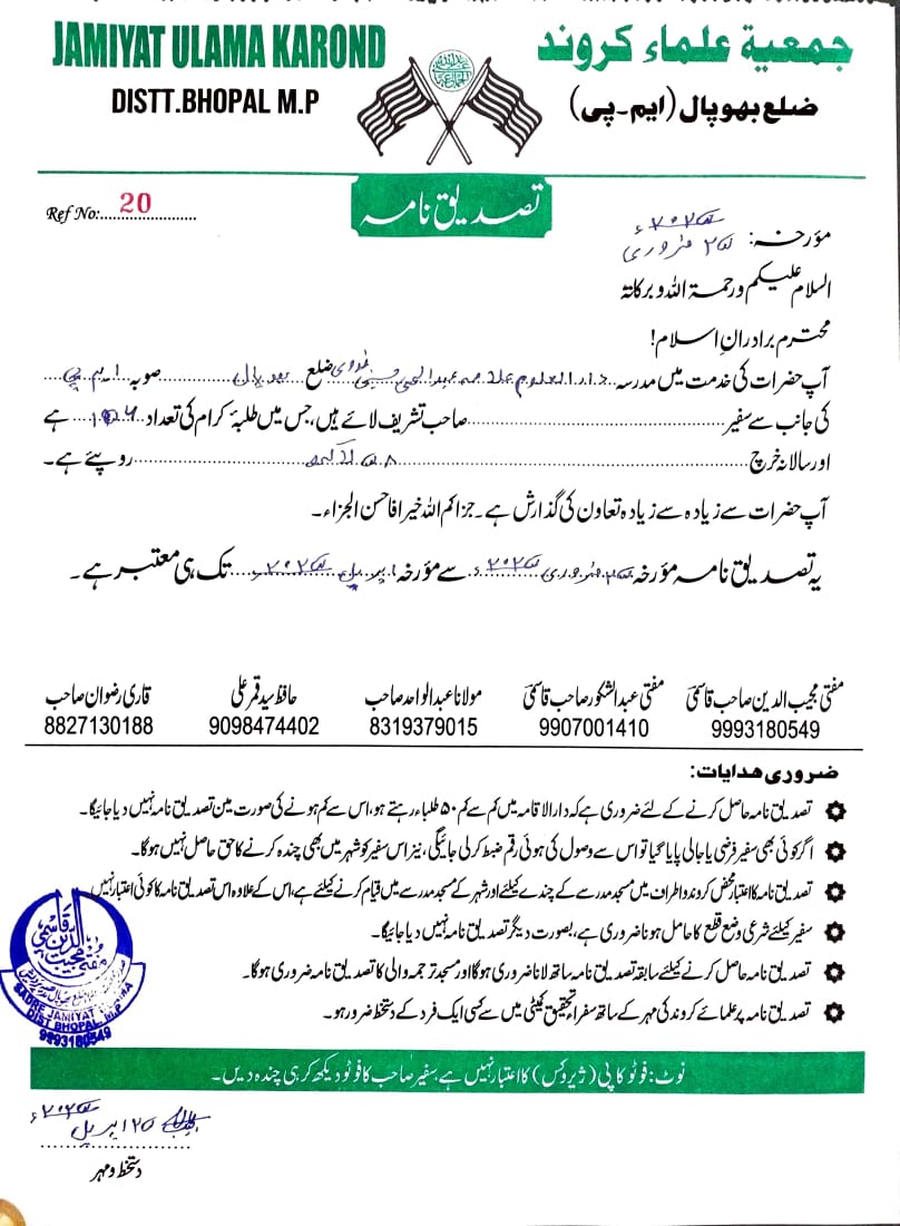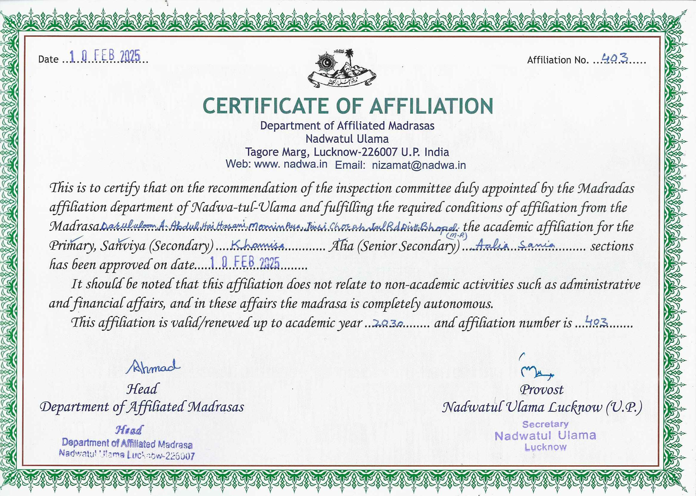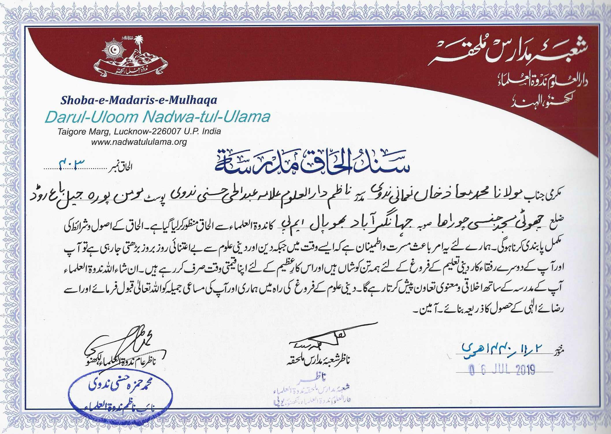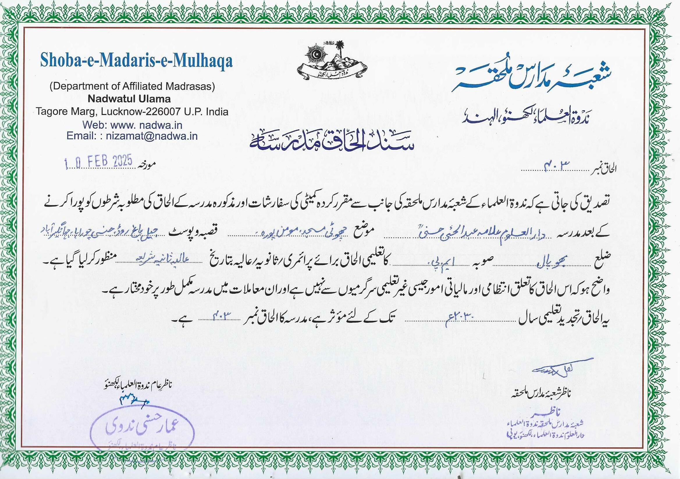 We offer our prayers in the court of Rabbul Izzat that Darul Uloom Allama Abdul Hai Hasani Nadvi Jinsi Chauraha, Jahangirabad in the city of Bhopal, which is a respectable branch of Darul Uloom Nadwatul Ulama Lucknow, in which education up to Showaba-e-Maktav, Showaba-e-Hifz and Showaba-e-Alimiyat Aliya Sania (Arabic Shashum) is continuing and complete, and Insha Allah, from this year, Showaba-e-Tajweed and Creation (Riwayate Hafs and Qiraate Saba'a) are also going to be started.